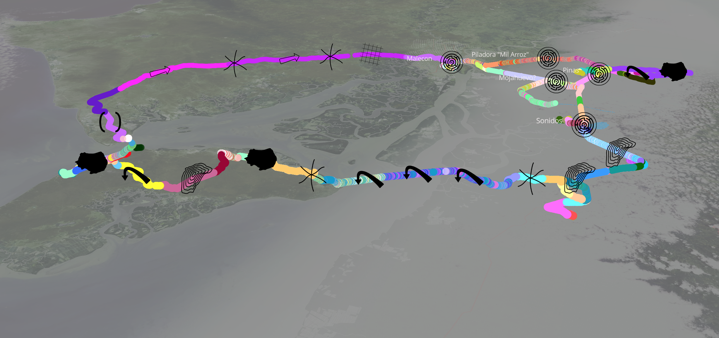 PRÁCTICAS DE PERIFERIA genera un conjunto integrado de herramientas digitales móviles para la documentación y expresión interpretativa sincrónica. Durante las experiencias de cada deriva, se genera un Portal que permite al visitante visualizar una cartografía intepretativa generada por el desplazamiento y los registros de lxs artistas.
